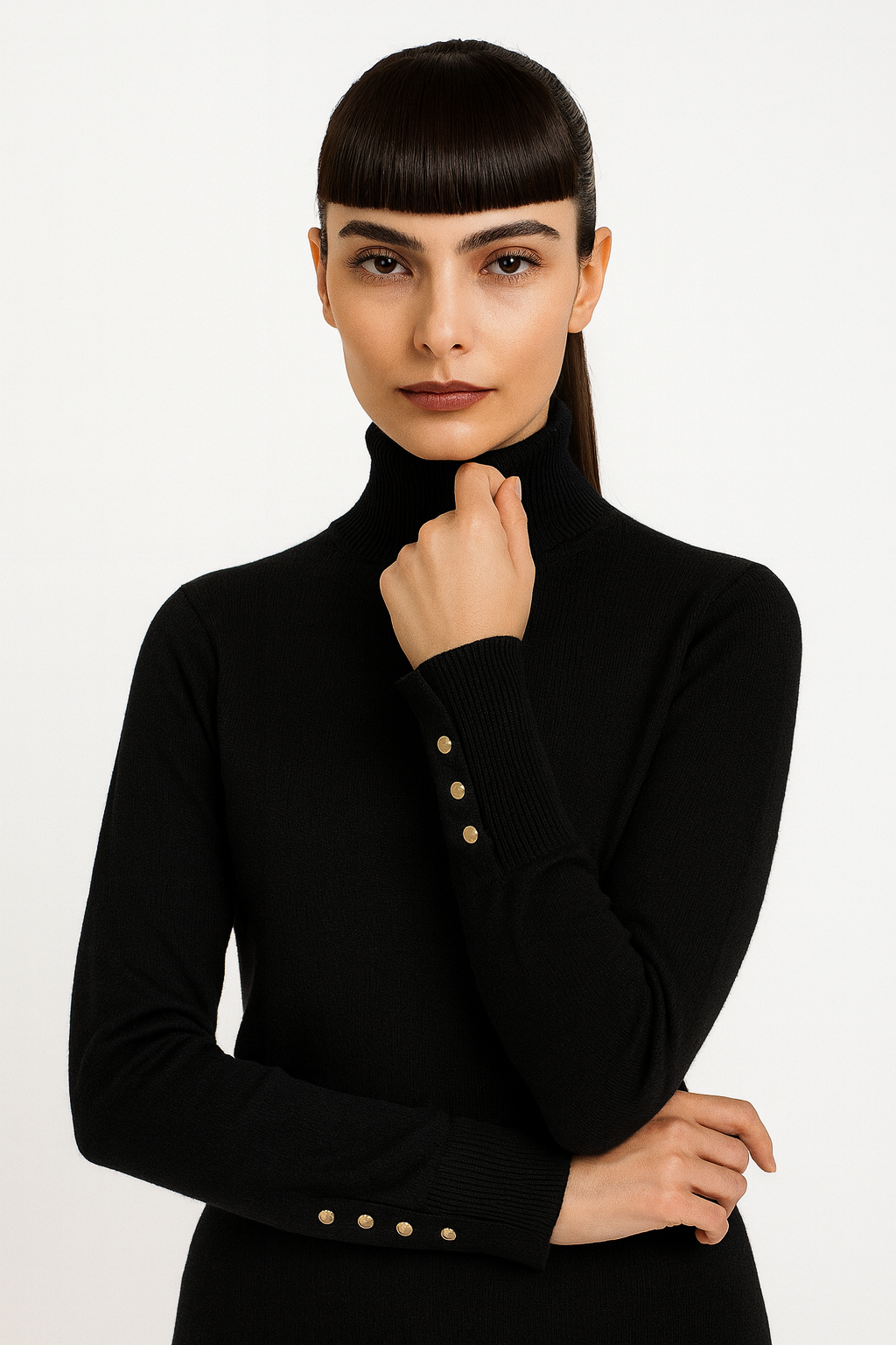 Klasikinė juoda spalva vizualiai lieknina, o auksinės sagos rankovėje suteikia išskirtinį, subtiliai prabangų akcentą, kuris patraukia žvilgsnį.