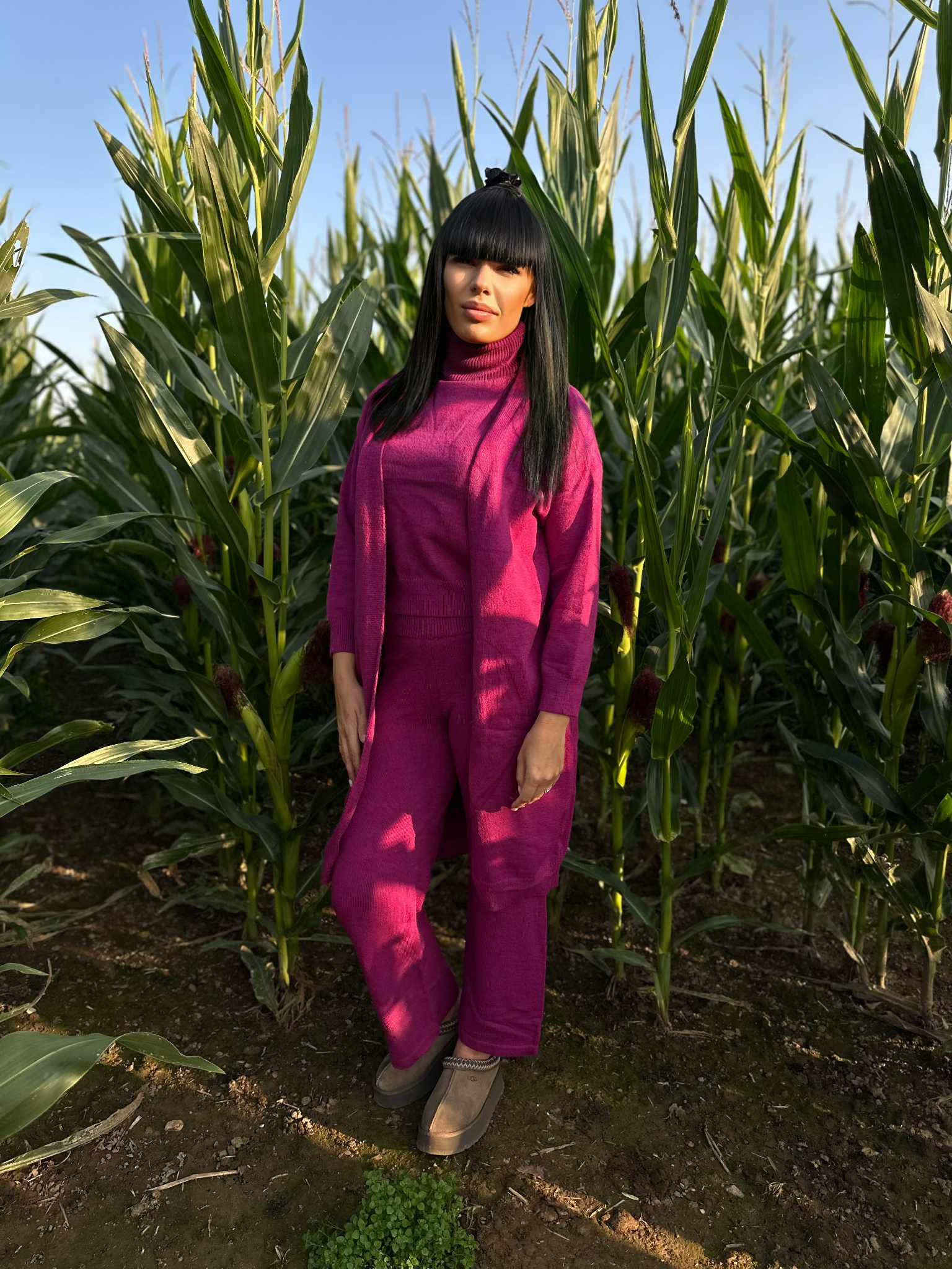 Šis trijų dalių kostiumėlis – ilgas kardiganas, golfo tipo megztinis ir patogios kelnės – yra tikras spalvų ir prabangos šedevras. Sukurtas iš natūralios alpakos vilnos, jis apgaubs jus šiluma, švelnumu ir nepamirštamu komfortu.