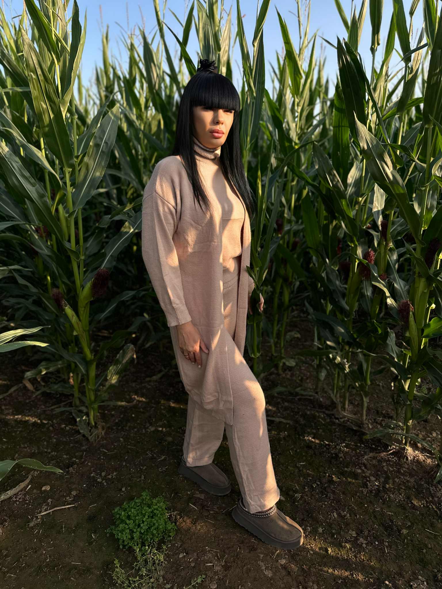 Įsisupkite į nepakartojamą šilumą ir švelnumą su šiuo trijų dalių kostiumėliu iš natūralios alpakos vilnos. Rinkinį sudaro ilgas kardiganas, golfo tipo megztinis ir patogios kelnės – tobula derinio harmonija, kai norisi jaukumo, tačiau neatsisakant stiliaus.